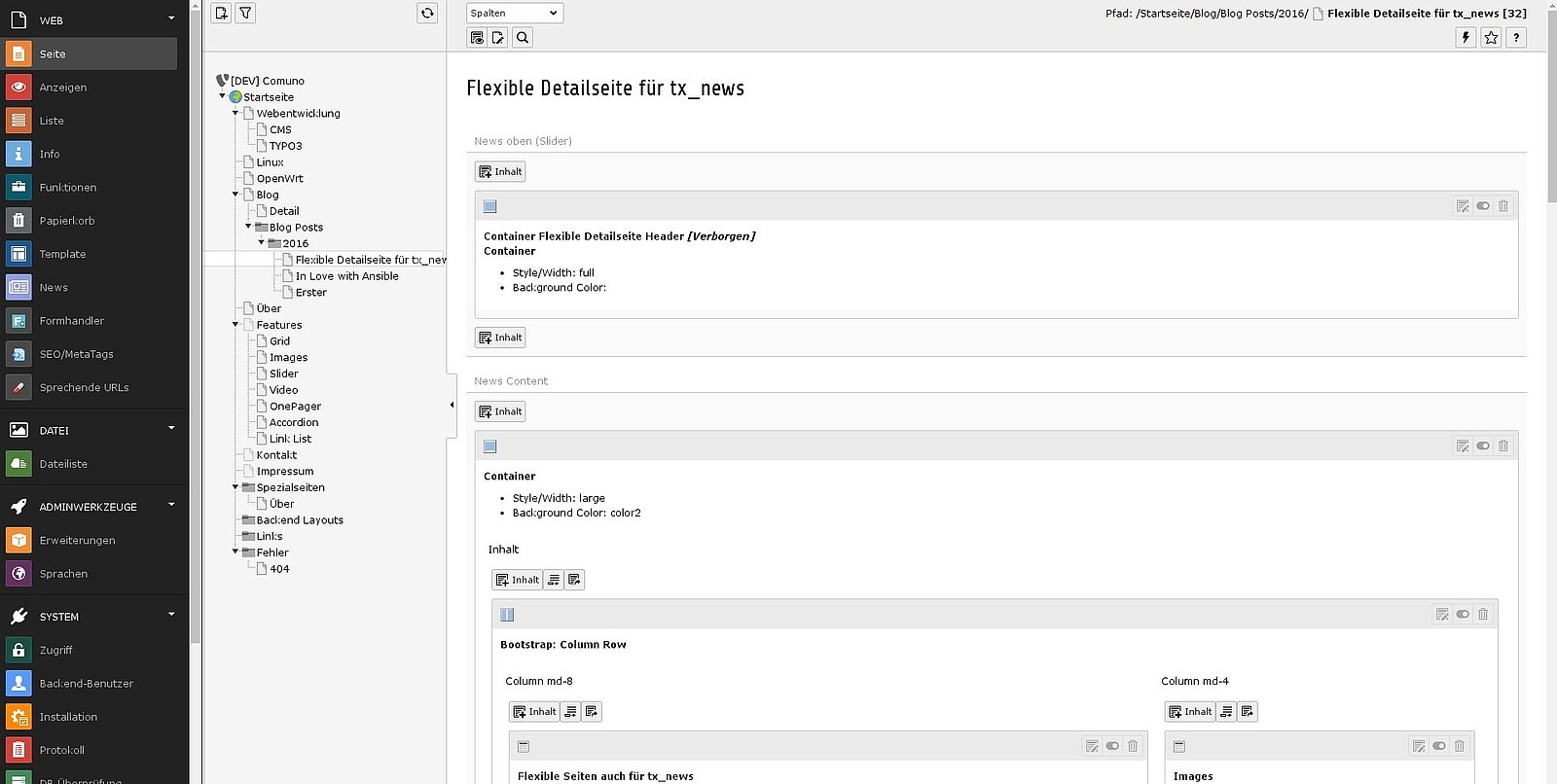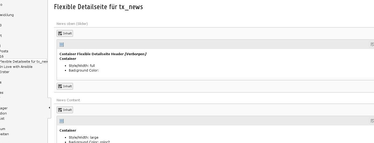 Die News-Extension für TYPO3 (tx_news) ist dank Fluid-Templates zwar bereits gut anpassbar, aber eben nicht wirklich flexibel. Man hat vorgegebene Elemente (Titel, Teaser, Beschreibung, Medien, Relationen, usw.), die dann an entsprechender Stelle im Template gerendert werden. Das war mir für die Detailseite zu starr, ich wollte wie auf normalen Seiten im TYPO3 die Inhalte flexibel zusammenstellen können und beliebige Inhaltselemente verwenden.